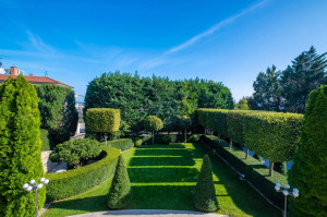 Telek jellemzői: rendezett, parkosított kert, igényes térburkolat